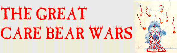 Gather round my children and I shall tell you a tale. A tale of terror, destruction and sickening violence. These are the true stories of heroism and extremly violent death that occured during the Great Care Bear Wars. Many probably thought the hapless creatures of the Kingdom Of Caring were unable to go to war and the Care Bears and Care Bear Cousins belived this to be true also. Unfortunatley they were wrong. Very wrong. The outbreak of war became reality when Tenderheart Bear, iron-fisted ruler of Care-A-Lot, felt his dominance was challenged by the leader of the Forest Of Feelings, Bravheart Lion. Tenderheart, well known for his short temper and tendency to fly off the handle, first took his anger out on little Baby Tugs Bear, beating him until he was severly injured and had to be hospitalised. Then Tenderheart employed the help of one Good Luck Bear, or G.L. Bear, to take care of his little lion problem. G.L. was known for his deadly aim, rarely missing his target.